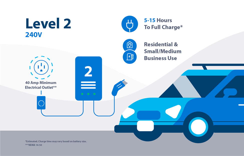 - Level 2 charging – Have a couple hours to spare? Public charging stations are equipped with Level 2 charging for times when you’re out running errands or at work.